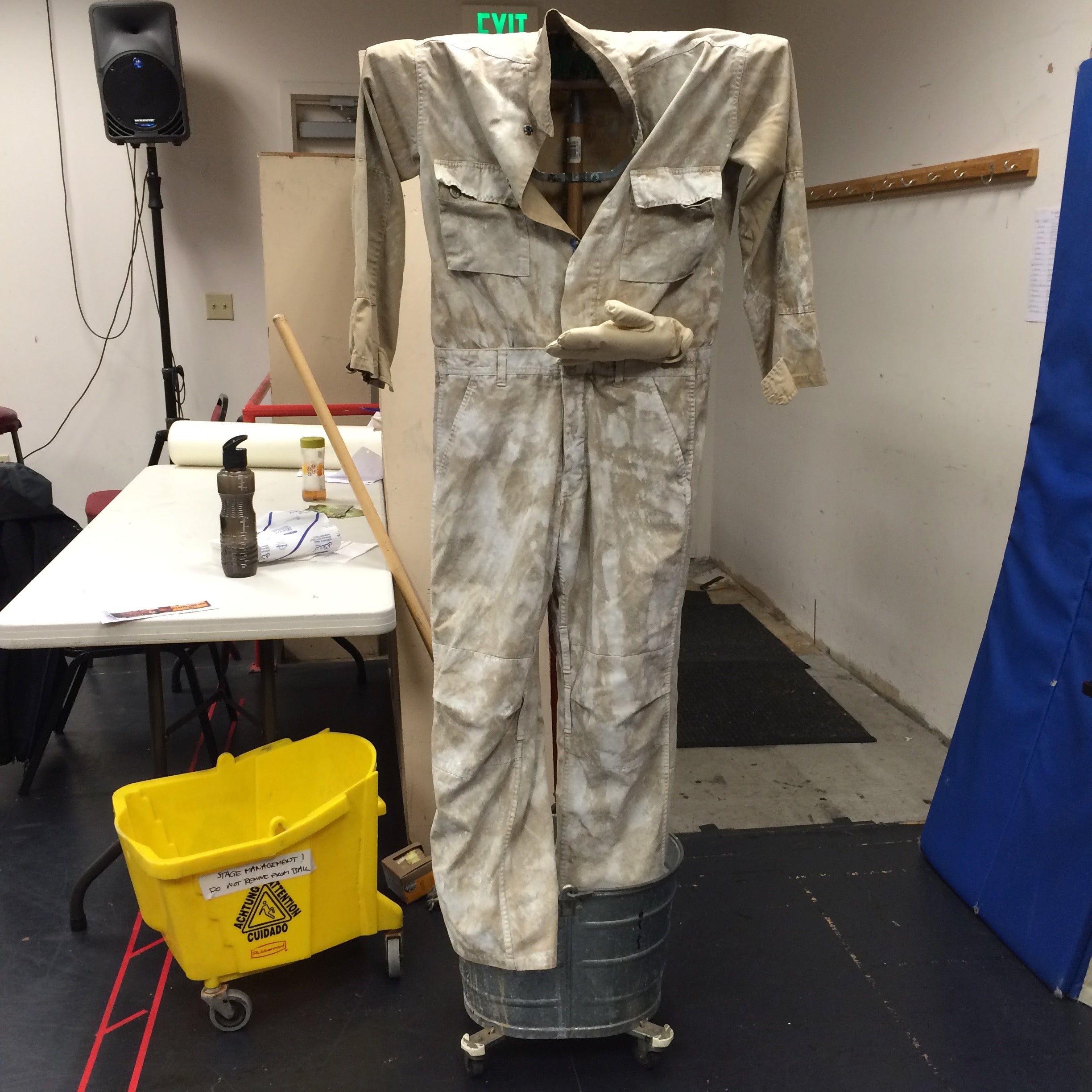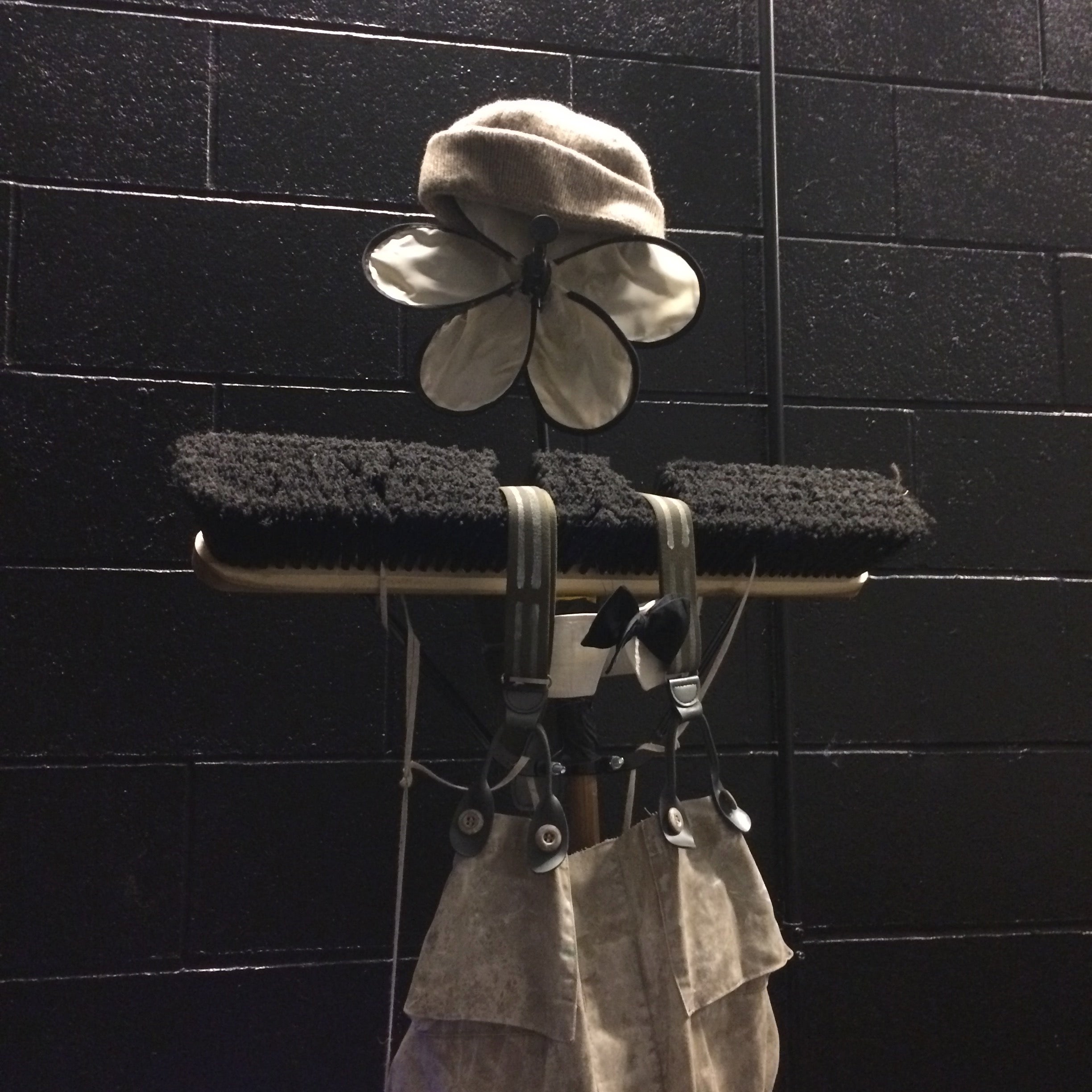 Broom, coveralls, wool, metal pail, wood, plastic, polyester, shellac.